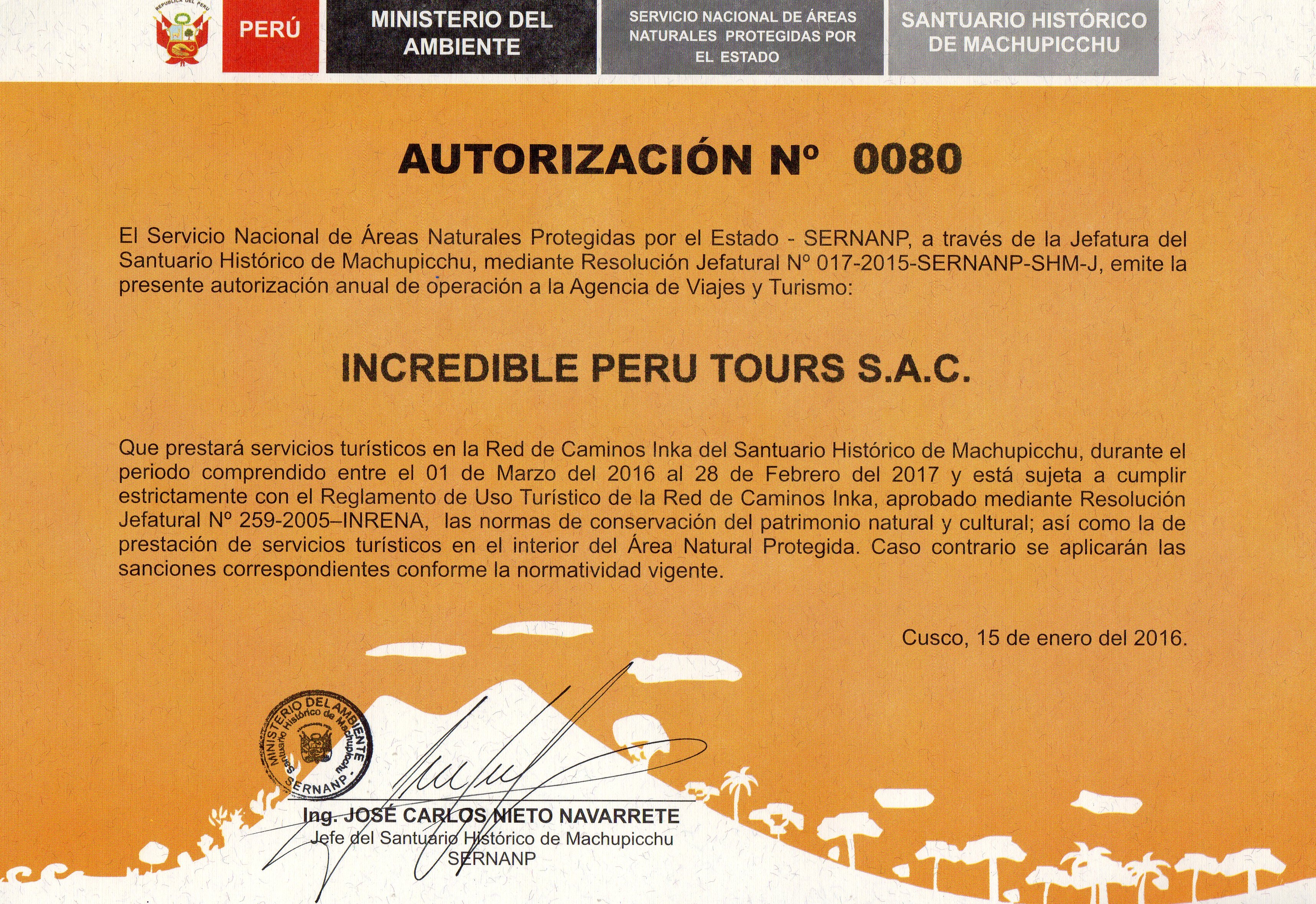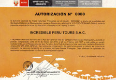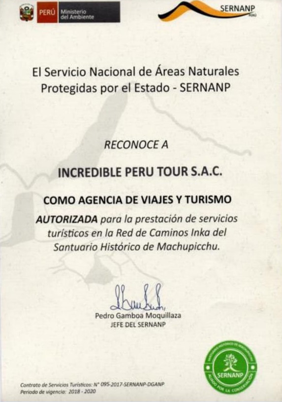 Notre Agence IPT est péruvienne, elle est enregistrée avec le RUC (Numéro de Registre Public) 20600652461 et est autorisée par le Ministère de la Culture sous le numéro AUT00080. Nous sommes Tour Operator autorisé depuis 2003. Chaque année depuis 2003 notre Agence renouvelle avec succès son autorisation pour l'année suivante. Nous tenons à préciser que l'accréditation n'est pas une simple formalité. Pour être autorisée, une agence doit justifier qu'elle a les moyens économiques, humains et matériels d'opérer, qu'elle a le personnel suffisant et compétant (qui doit être lui aussi autorisé) et enfin une inspection a lieu pour vérifier que les conditions matérielles et de sécurité sont respectées. Sans faillir une seule fois, notre agence a su garantir tout cela depuis 22 ans !